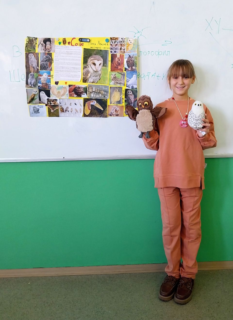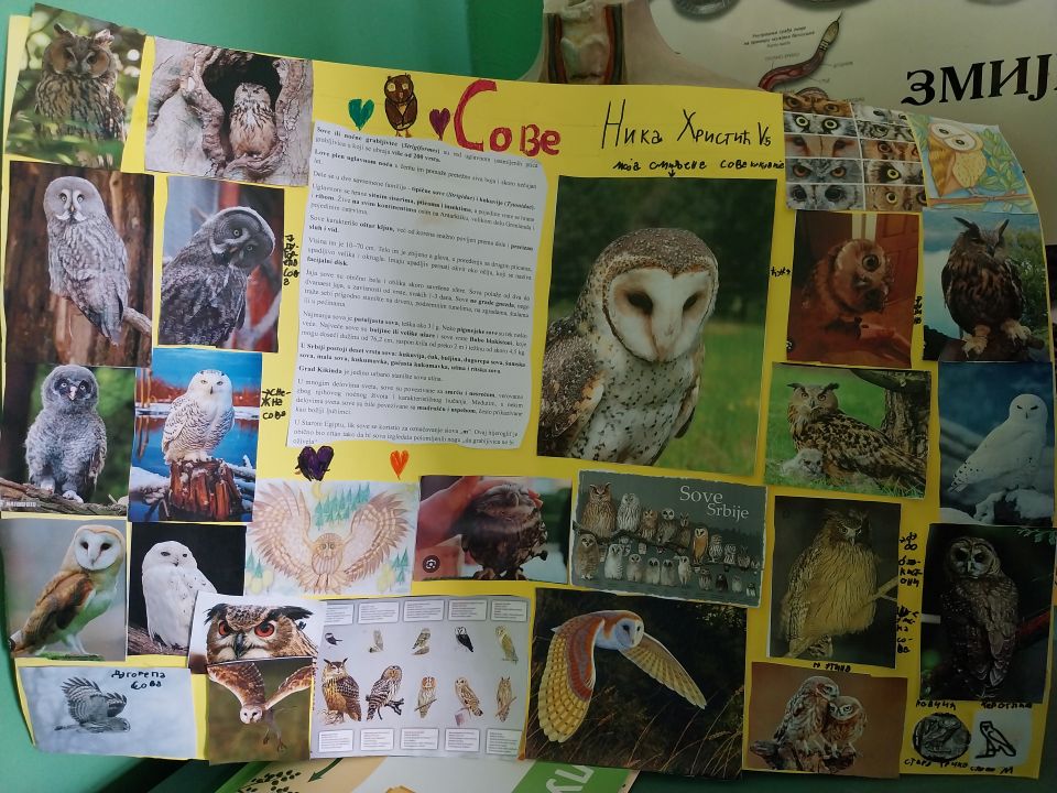 А онда је Ника раширила постер са фотографијама сова, њених омињених птица, ставила огрлицу са сликом сове, извукла сове луткице, од којих једна емитује хук сове и сви смо као хипнотисани слушали Никино право правцато предавање о овим птицама. Ника зна систематику сова, начин исхране и размножавања, место у ланцима исхране, еколошки значај и угроженост врста, а тек митологију! Ма зна све о њима! На свако питање које су другари поставили имала је одговор!