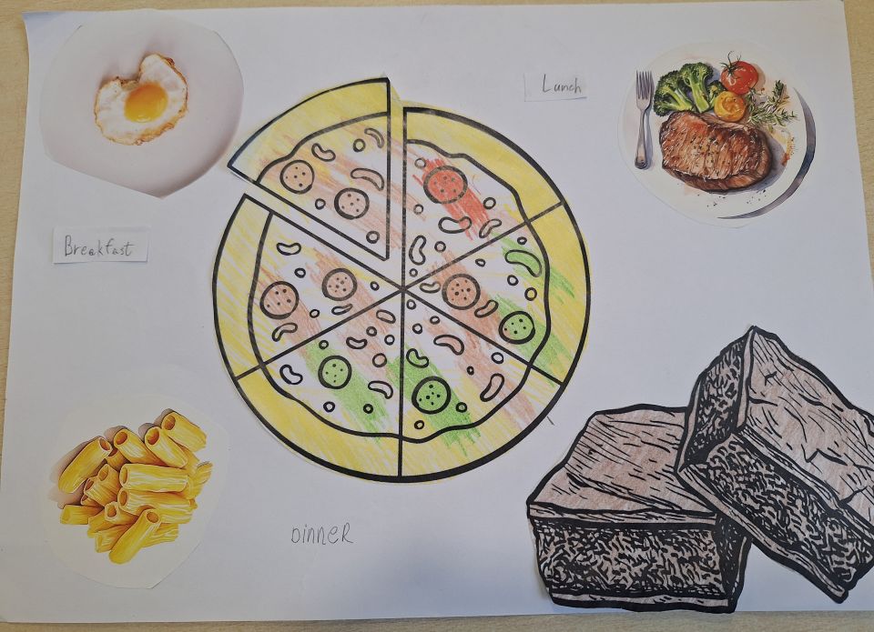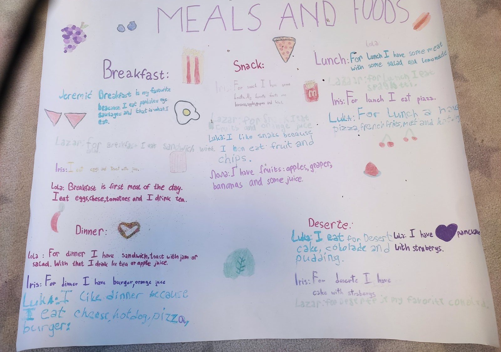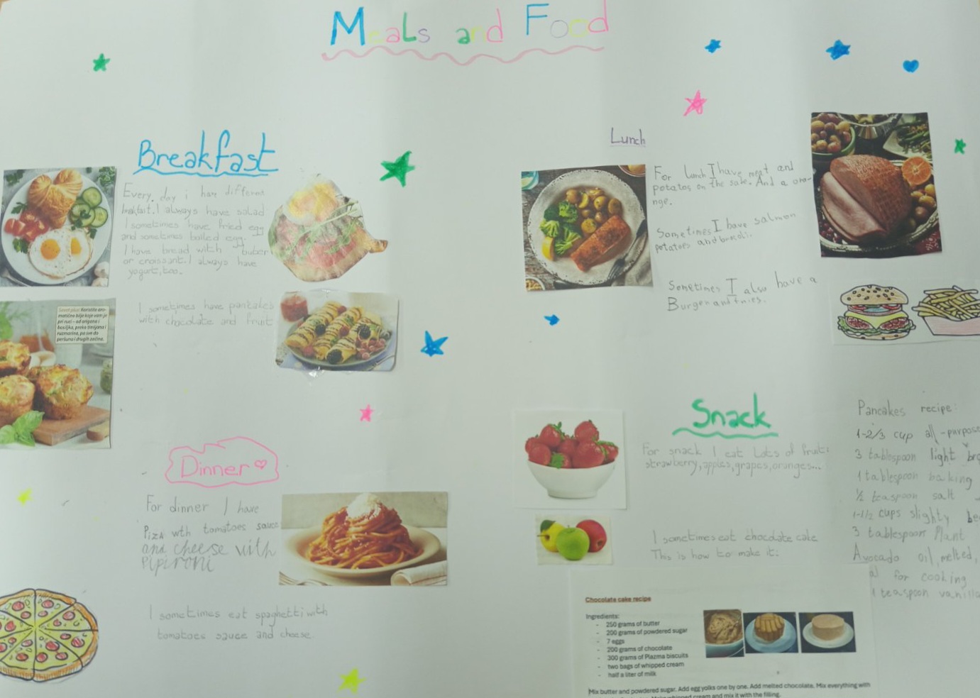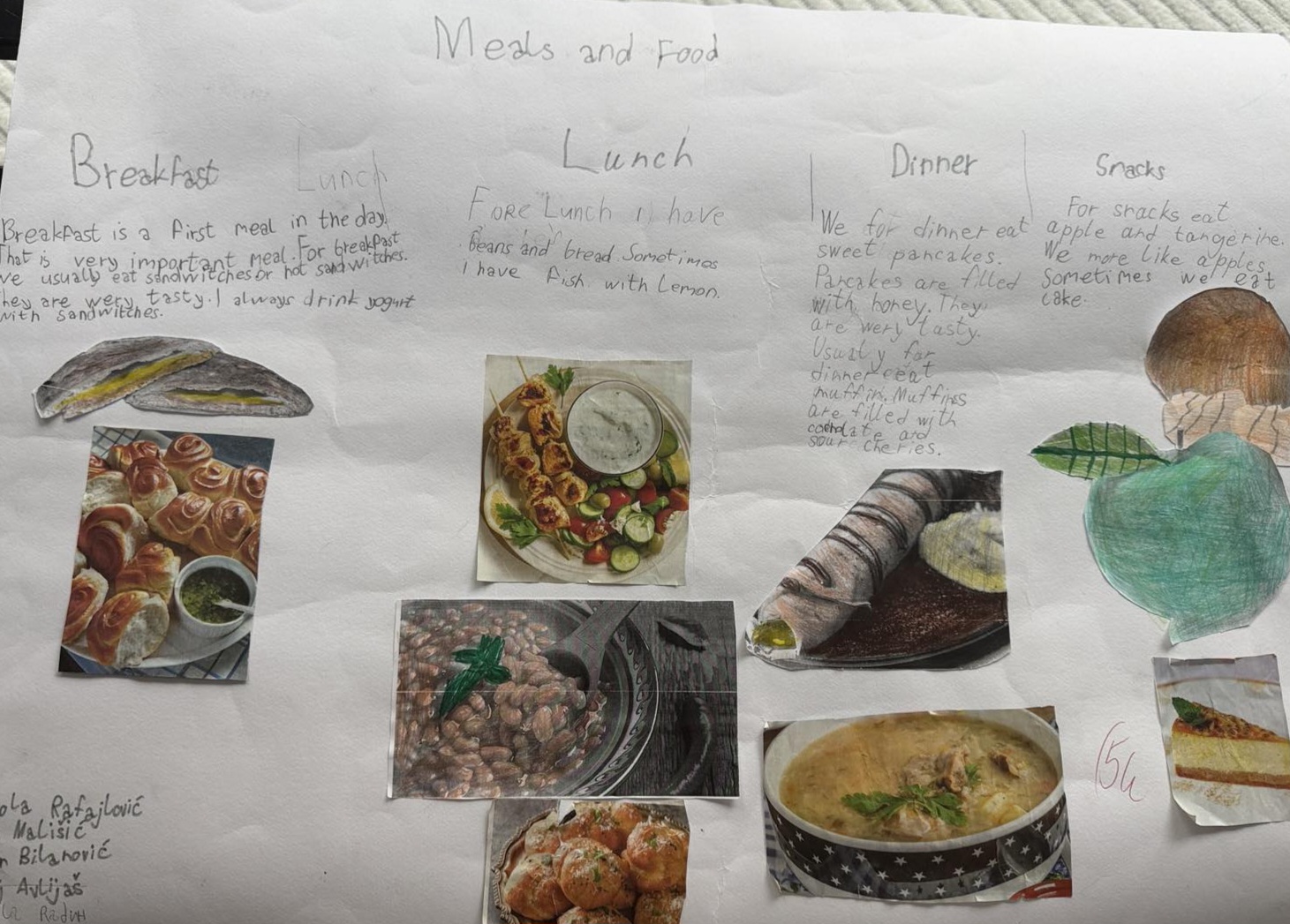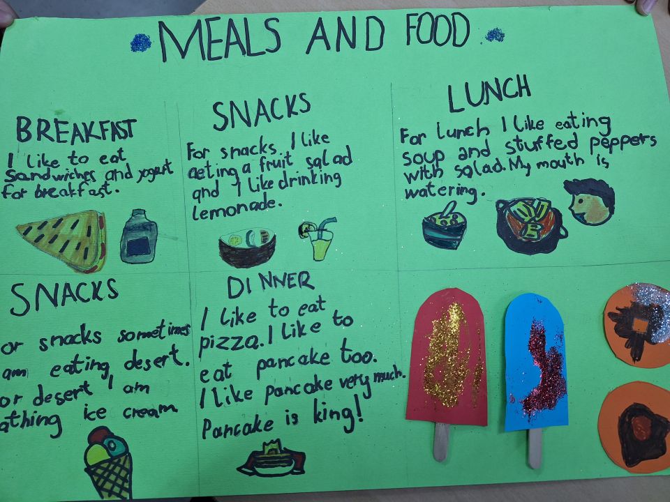На часу енглеског језика, ученици четвртог разреда су радили пројекат у групама на тему Храна и оброци ( Food and Meals). Ученици су уживали у овом групном раду, тимски сарађивали и обновили вокабулар везан за храну и оброке. Показали су маштовитост и креативност и изразили жељу да чешће раде овакве пројекте.